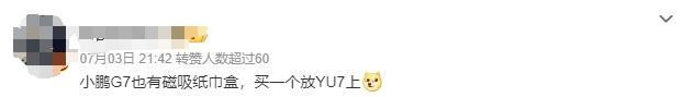 针对两款车载磁吸纸巾盒的价格差异,有网友评论称“小鹏G7也有磁吸纸巾盒,买一个放YU7上"。
