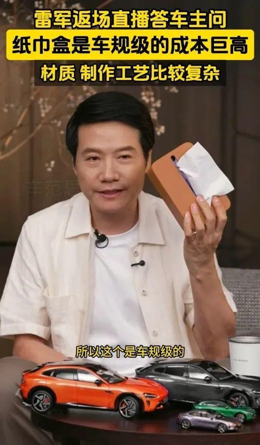 雷军说,这个纸巾盒设计的时候,材质、制作工艺比较复杂,刚开始过不了车规的测试。后来又改了材质和胶,成本巨高无比。